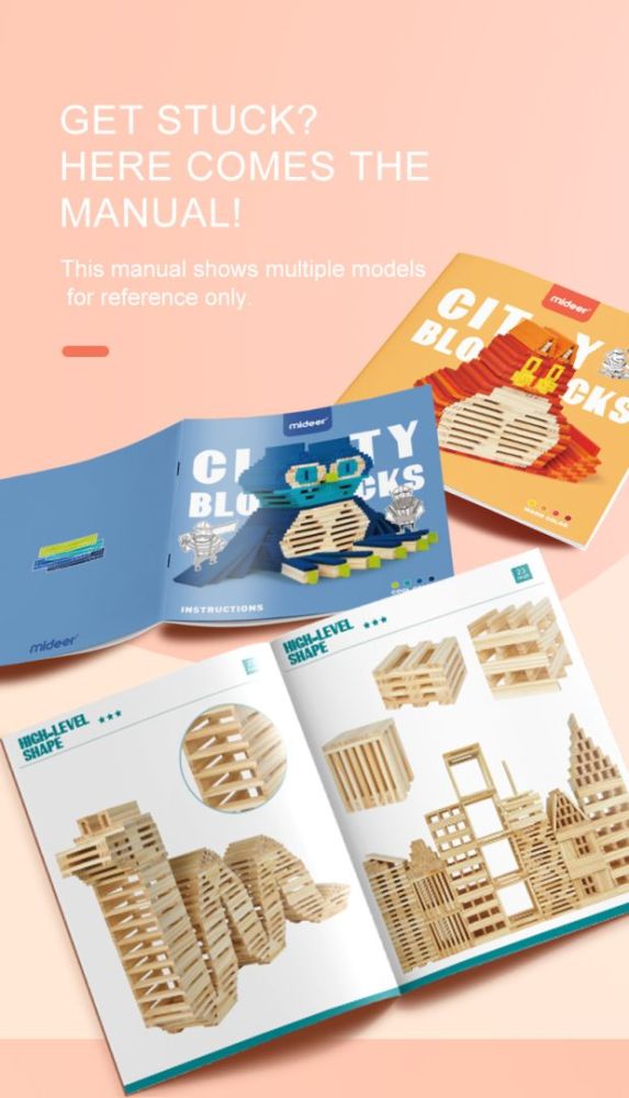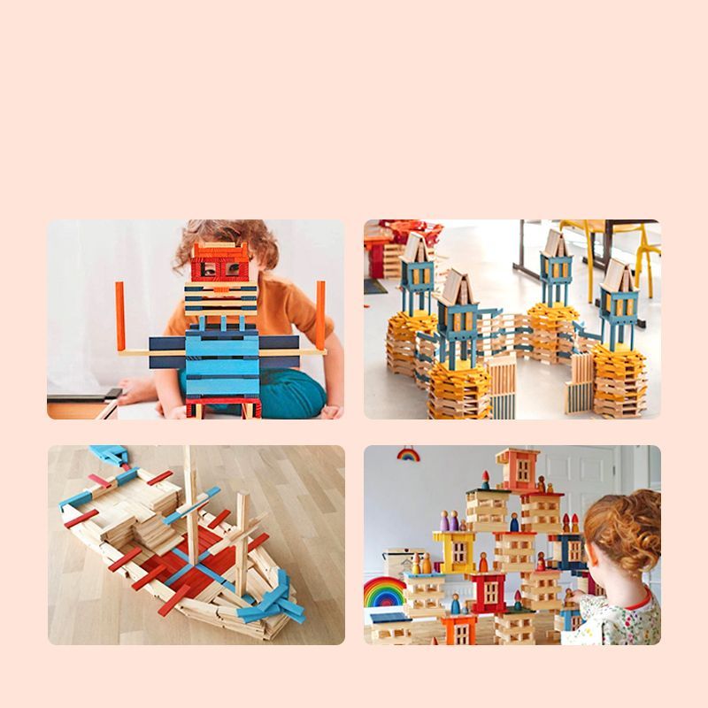Sada obsahuje 50 pečlivě opracovaných dřevěných bloků v jednotném tvaru, což umožňuje stavět neomezené množství konstrukcí – od jednoduchých domečků přes lodě až po vysoké věže či celé městské scenérie.