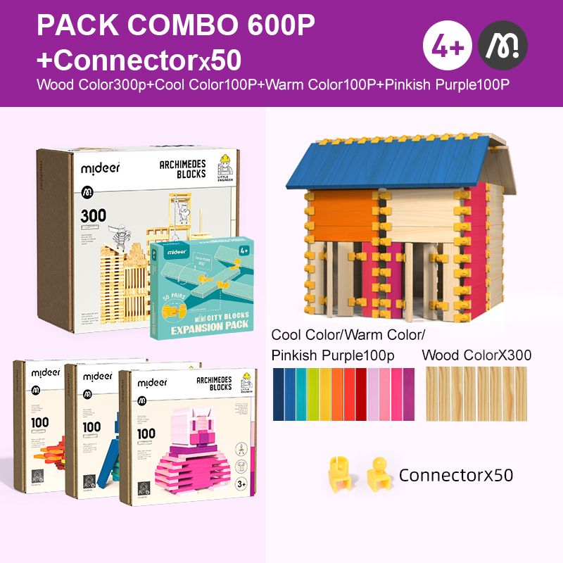 Sada obsahuje 600 pečlivě opracovaných dřevěných bloků v jednotném tvaru, což umožňuje stavět neomezené množství konstrukcí – od jednoduchých domečků přes lodě až po vysoké věže či celé městské scenérie. Spojky z řady Mideer Blocks rozšiřují možnosti klasické stavebnice o nový rozměr tvoření. Díky nim se hra promění v opravdové stavitelské dobrodružství – dítě získá prostor pro fantazii, trpělivost a rozvoj technického myšlení.Díky nim děti mohou spojovat kostky pod různými úhly a vytvářet 3D konstrukce, mosty, věže i domy podle vlastní fantazie.