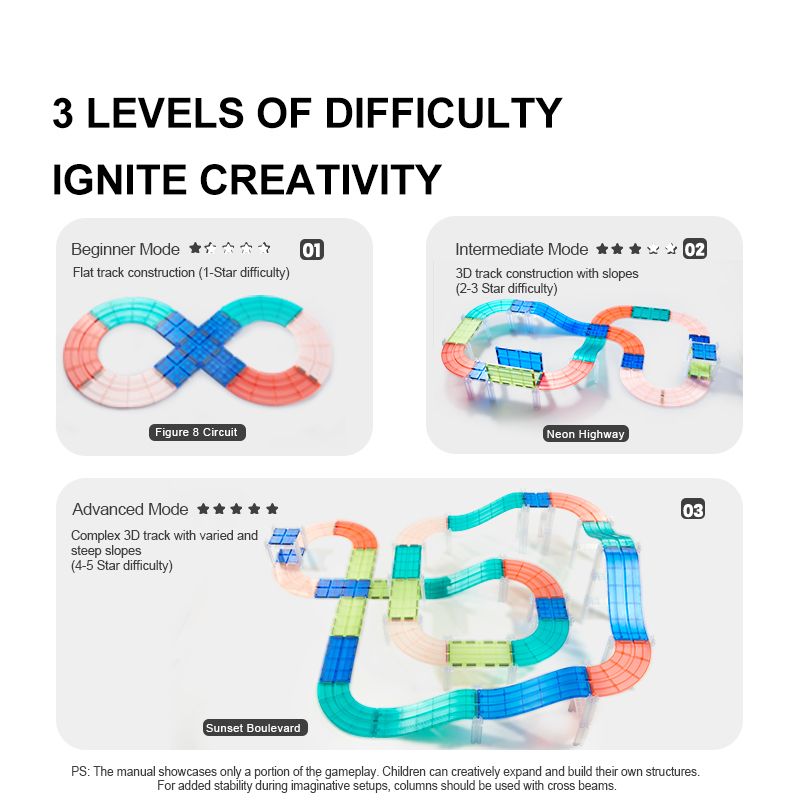 Magnetické dílky jsou robustní, díky zaobleným rohům jsou dílky bezpečné i pro malé děti. Jednotlivé dílky jsou důmyslně vytvořeny s drážkami pro jízdu autíček a díky průhledným živým barvám celá autodráha vytváří dojem magické stavby.