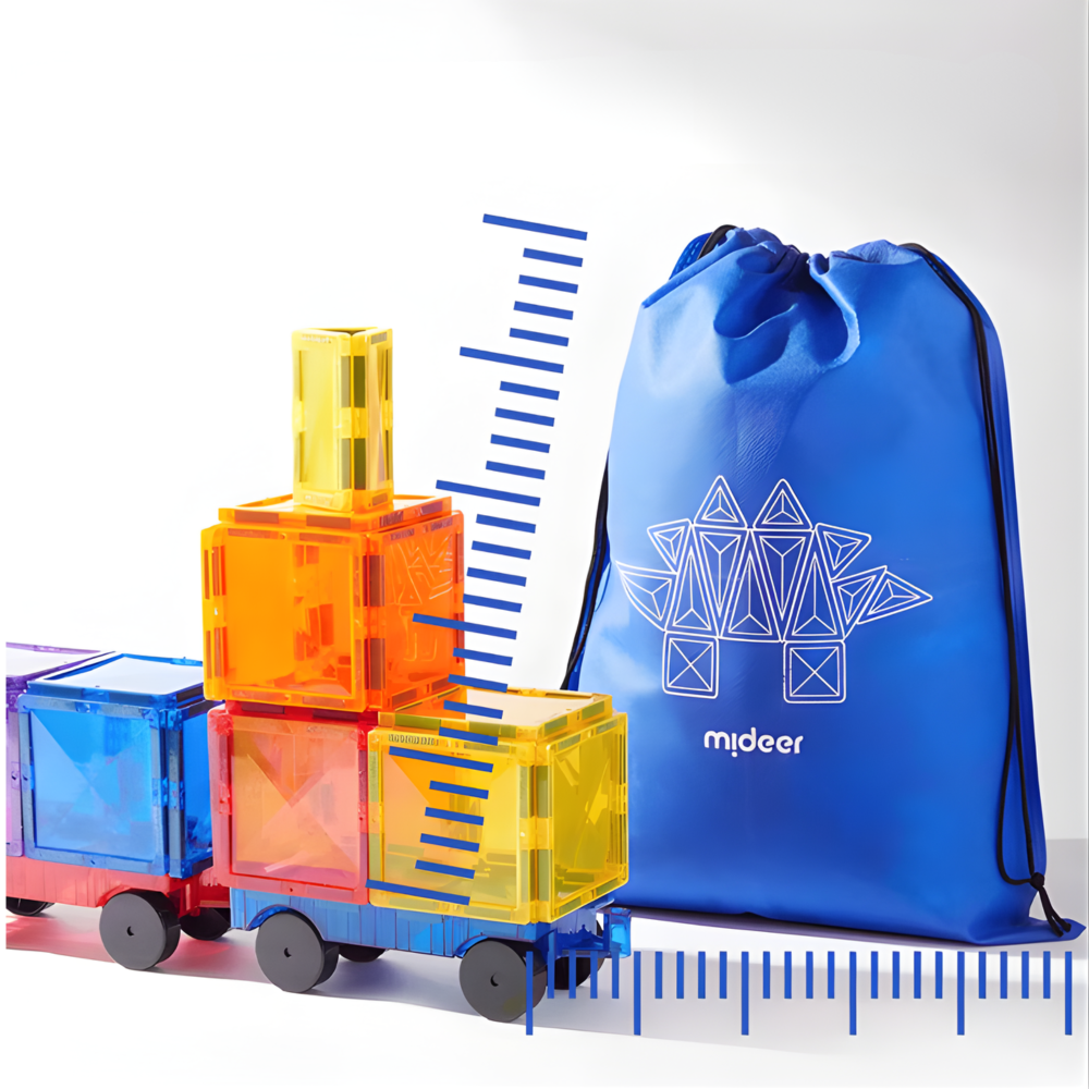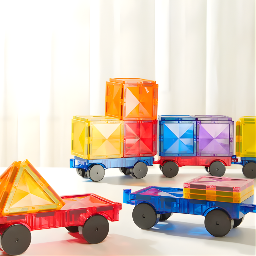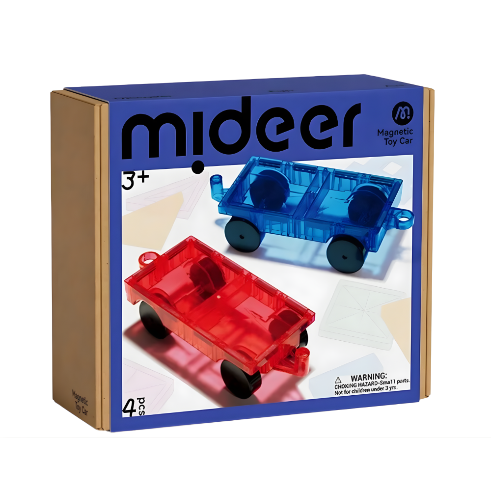 Zestaw zawiera dwa solidne i przezroczyste samochodziki w kolorze niebieskim i czerwonym, które zostały zaprojektowane tak, aby łatwo łączyć różne elementy magnetyczne i umożliwiać budowanie ruchomych konstrukcji – od prostych pojazdów po złożone systemy transportowe.