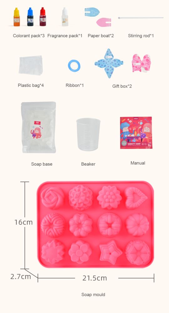 W zestawie znajduje się silikonowa forma o pojemności do 12 mydeł, która zapewnia wystarczającą ilość miejsca do eksperymentowania i rozwijania wyobraźni.